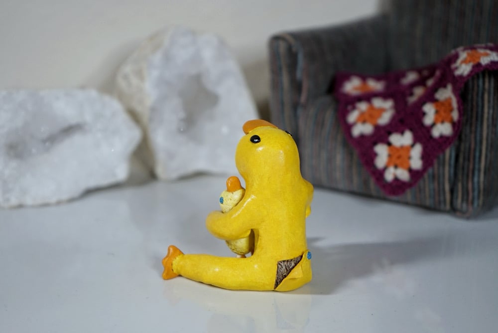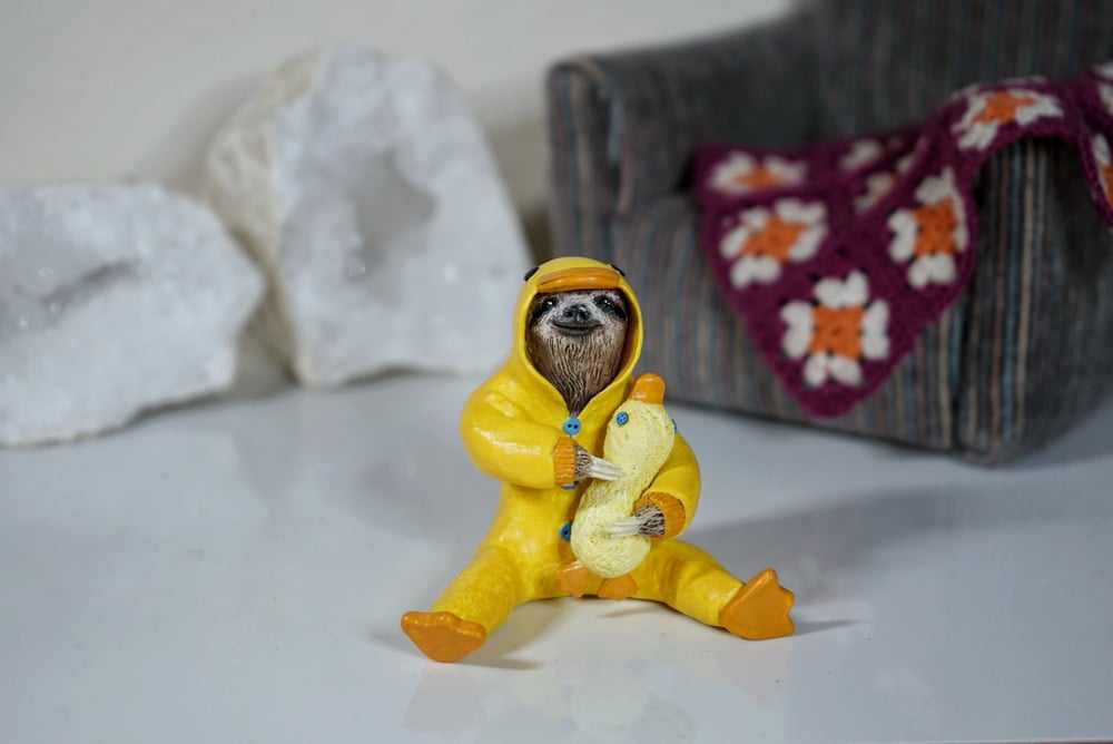Sloth in a Ducky Onesie features a Three-Toed sloth, wearing a bright yellow ducky onesie decorated with blue buttons and holding a plush ducky. Cute little butt flap in the back!