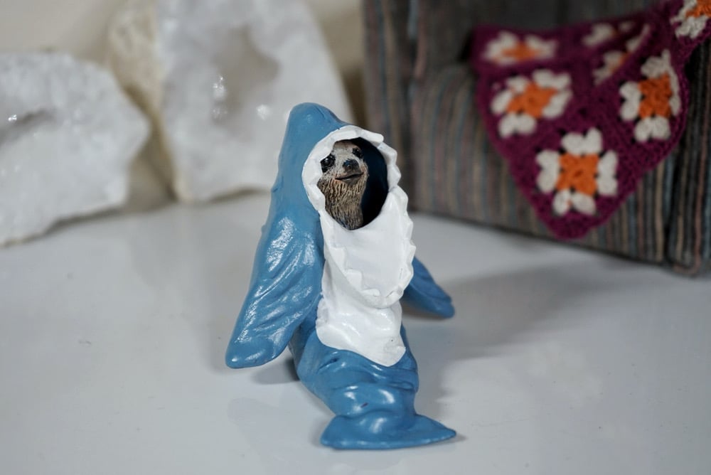 Sloth in a Shark Onesie features a Three-Toed sloth, wearing a blue shark blanket/onesie with a hood flap with teeth all around!